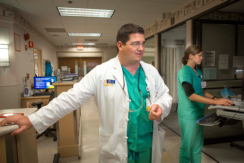 What is next for the Burn Center? Its team is focused on training the next generation of burn care providers and partnering within the region to assist in the care of devastating skin and soft-tissue diseases, including hidradenitis suppurativa, toxic epidermal necrolysis, and Stevens-Johnson syndrome. The team is revitalizing a Burn Surgery Fellowship program to help meet the needs of a shrinking burn surgeon workforce in the U.S.
